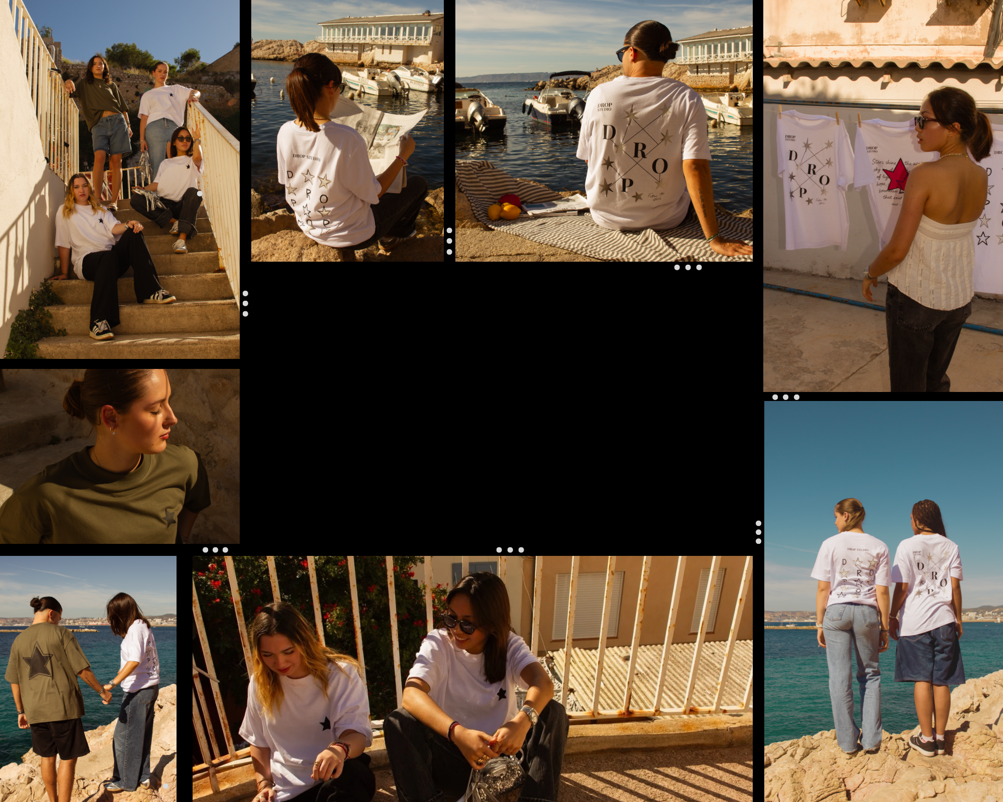 En février 2025, cette envie a pris forme avec la naissance de DROP STUDIO. Chaque pièce est pensée comme un fragment d’histoire : simple, forte et fabriquée avec soin. Nos collections naissent à Marseille, en collaboration avec l’atelier Scrap House et un réseau d’ateliers locaux, car nous voulons que chaque vêtement raconte un lieu et un savoir-faire. Selon les modèles, nous utilisons la sérigraphie artisanale et l’impression DTF de haute qualité pour mêler tradition et modernité.